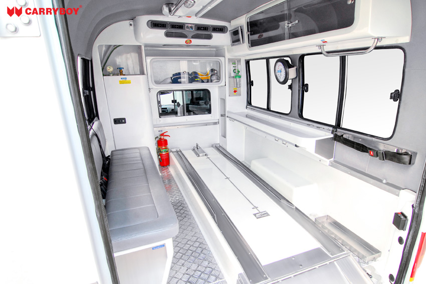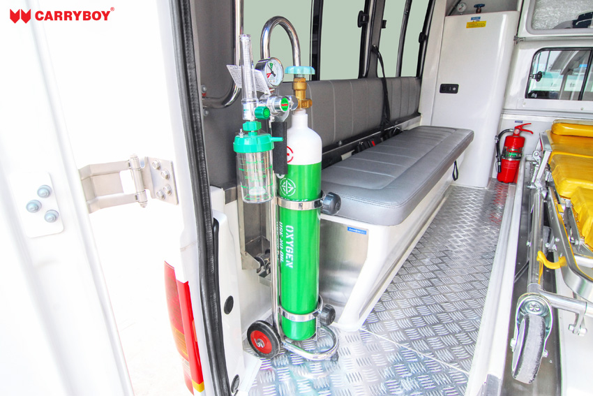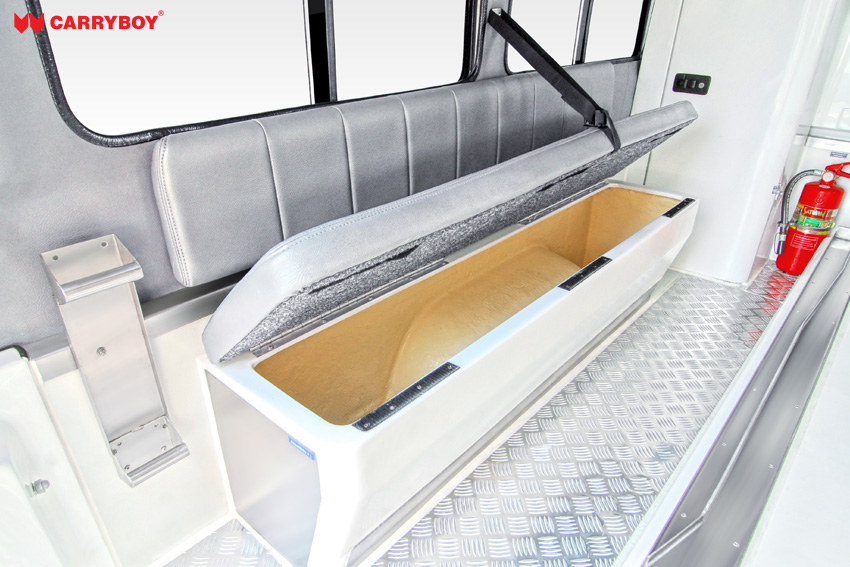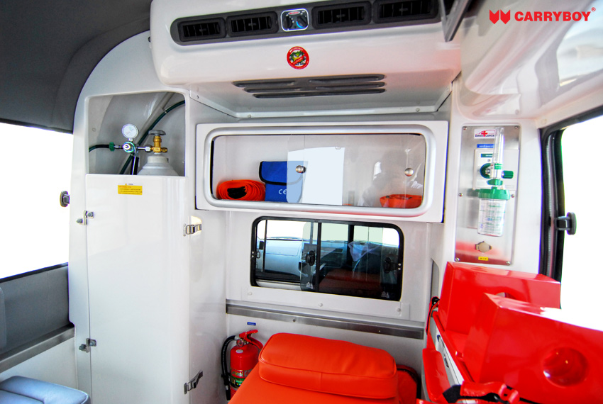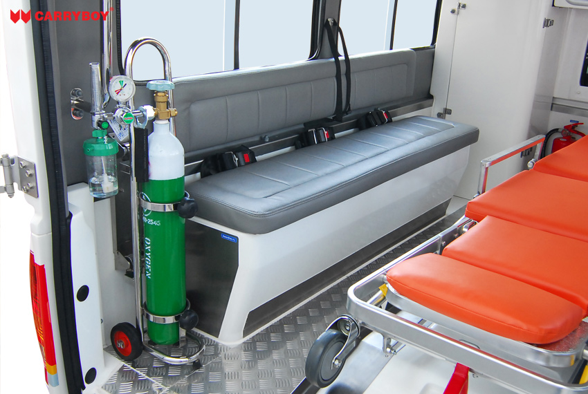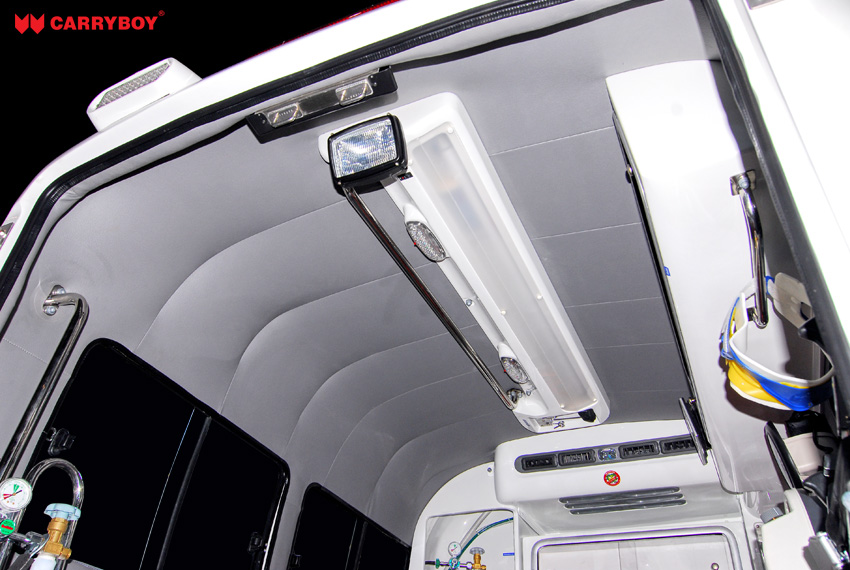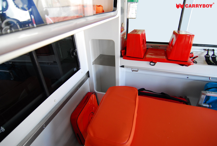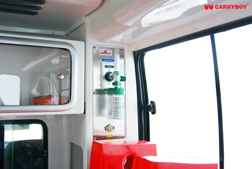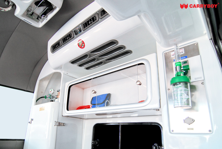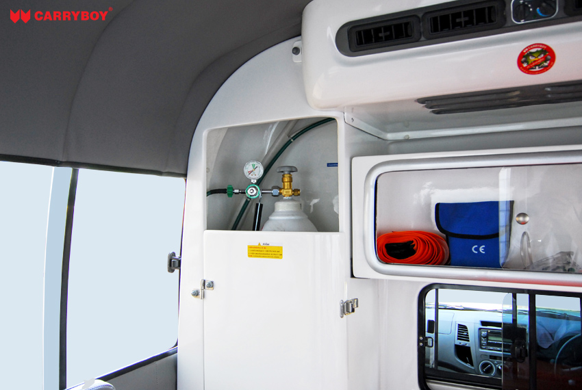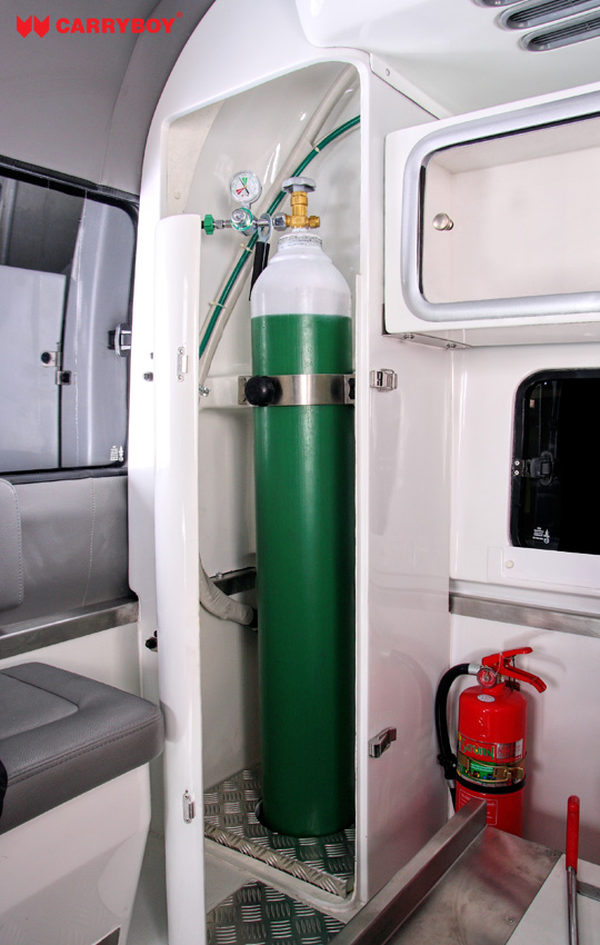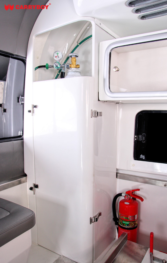 Interior with seamless fiberglass, fiberglass cabinet for oxygen tank storage. Cooling