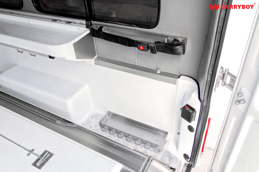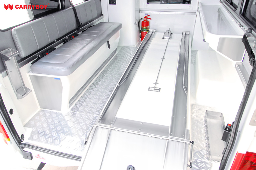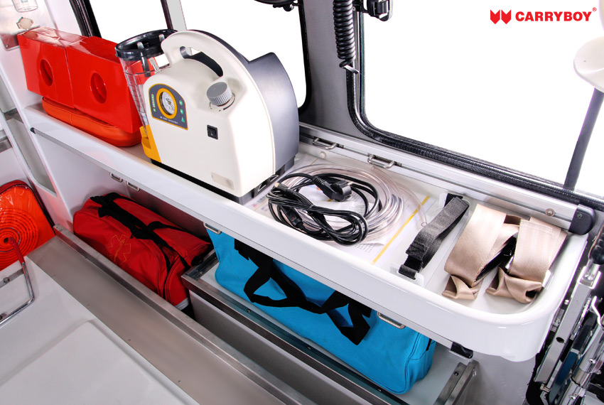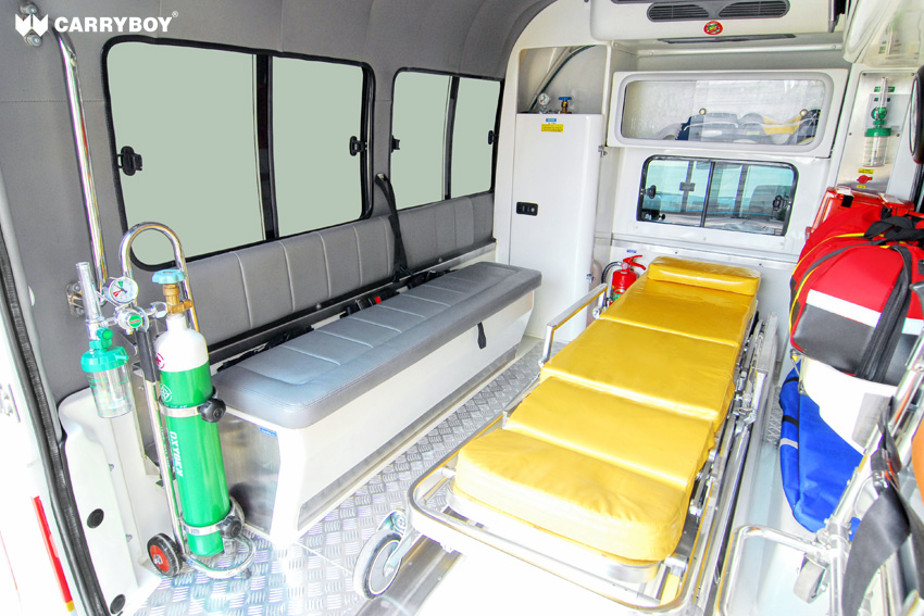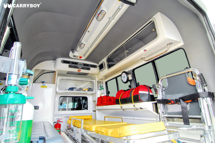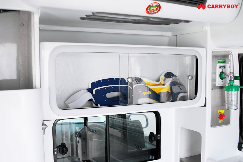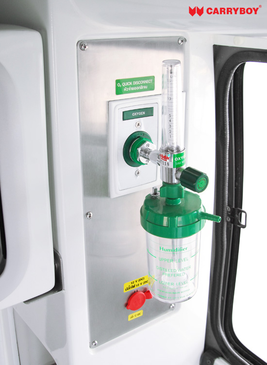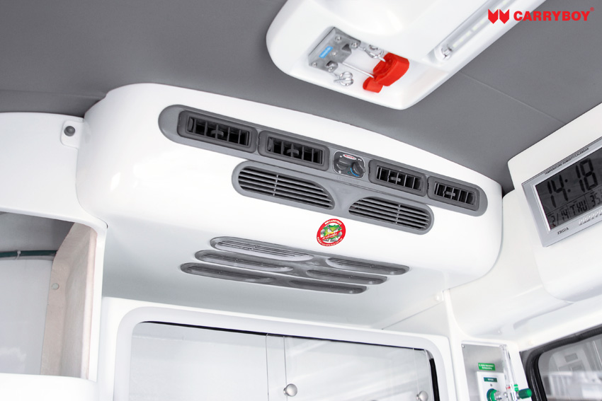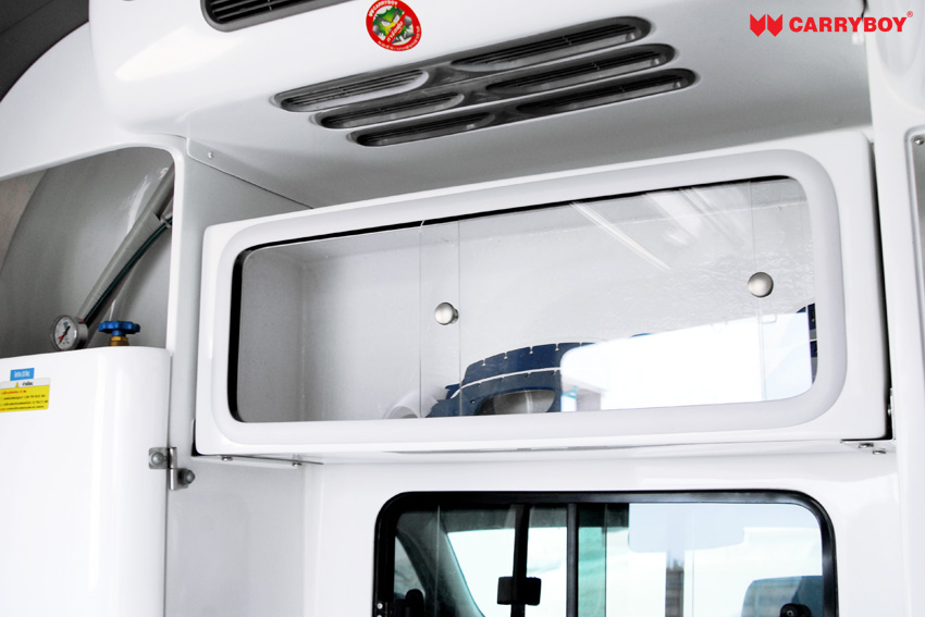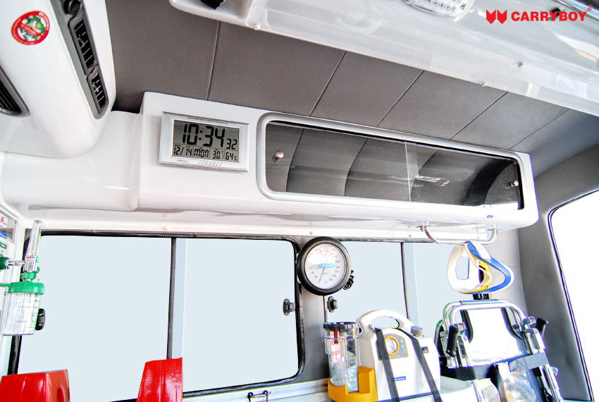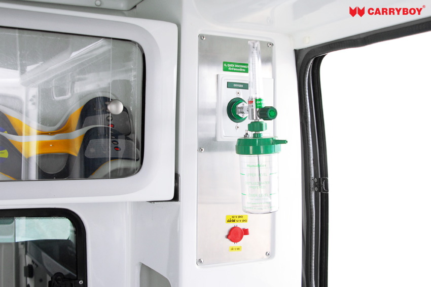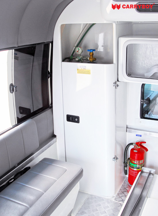 Interior with seamless fiberglass, fiberglass cabinet for oxygen tank storage. Cooling