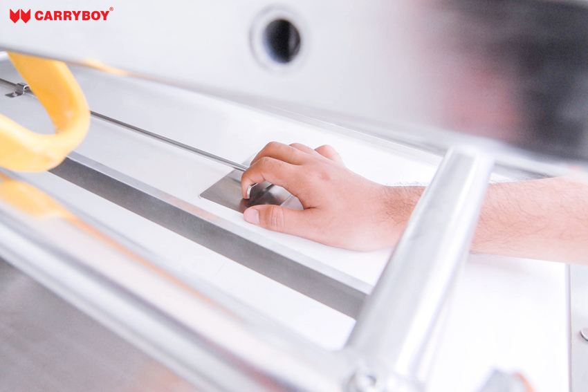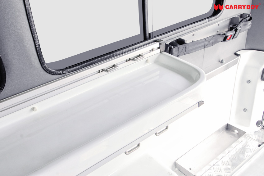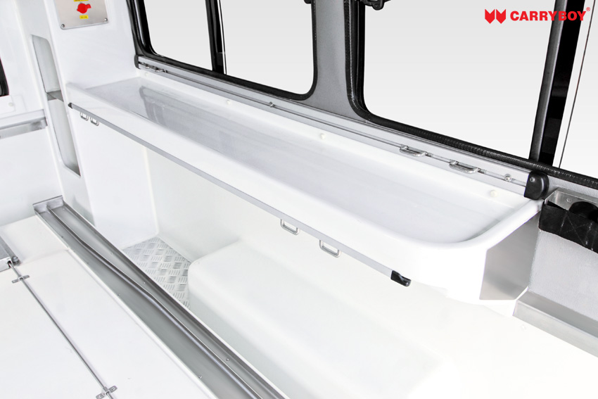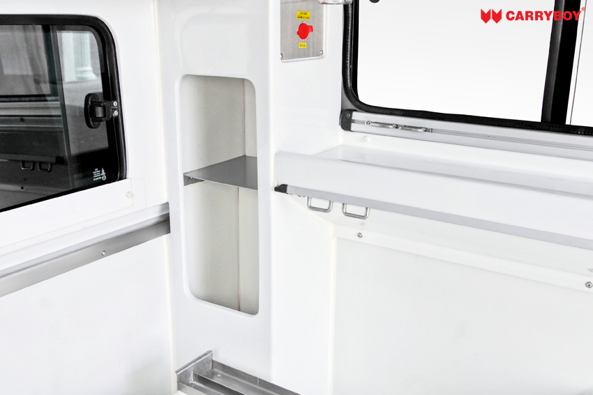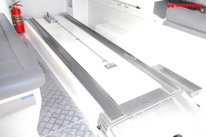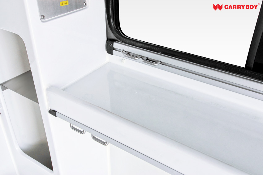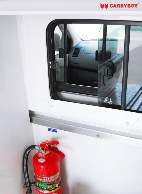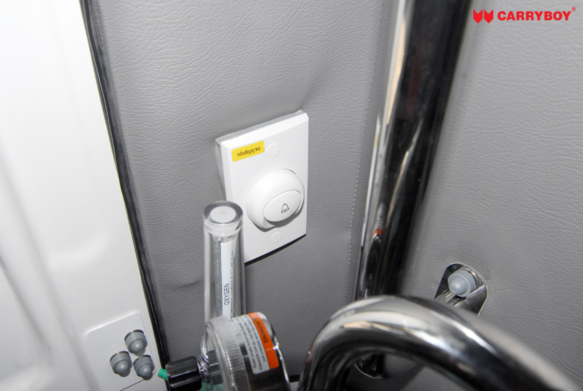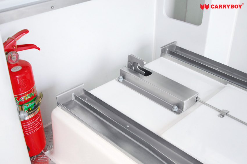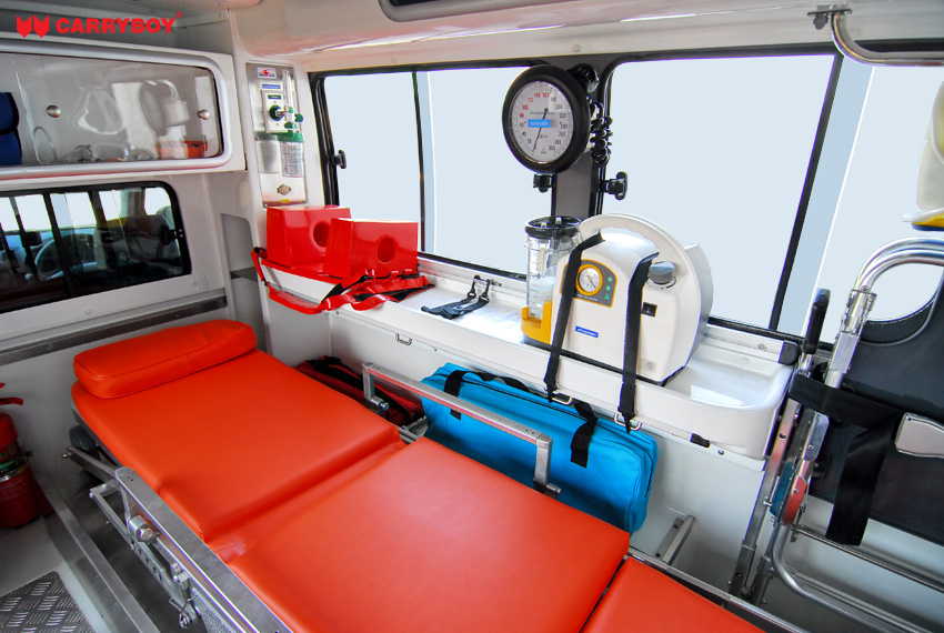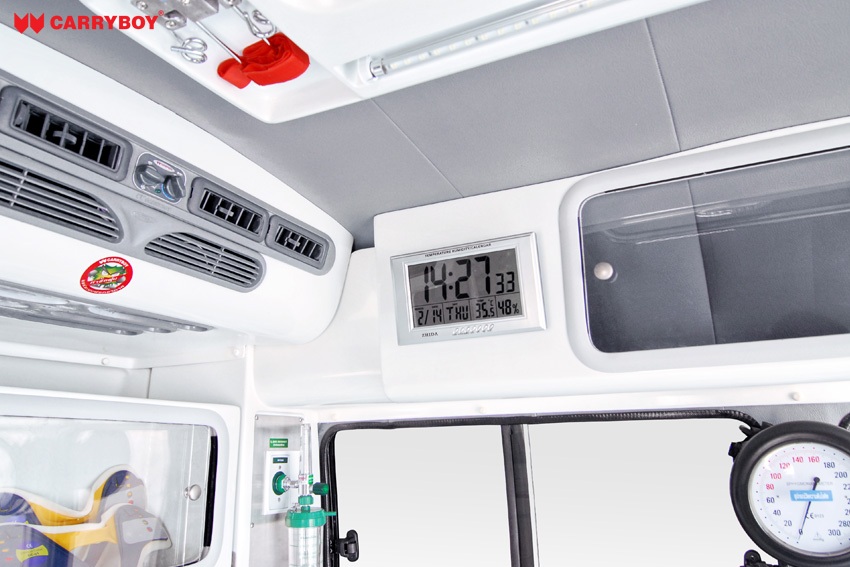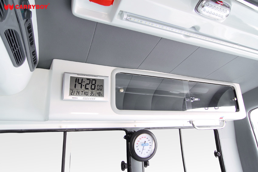 Interior with seamless fiberglass, fiberglass cabinet for oxygen tank storage. Cooling